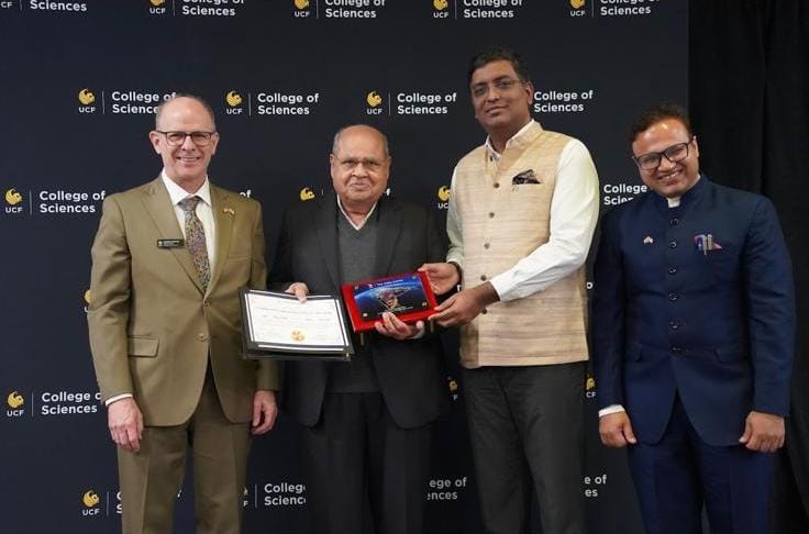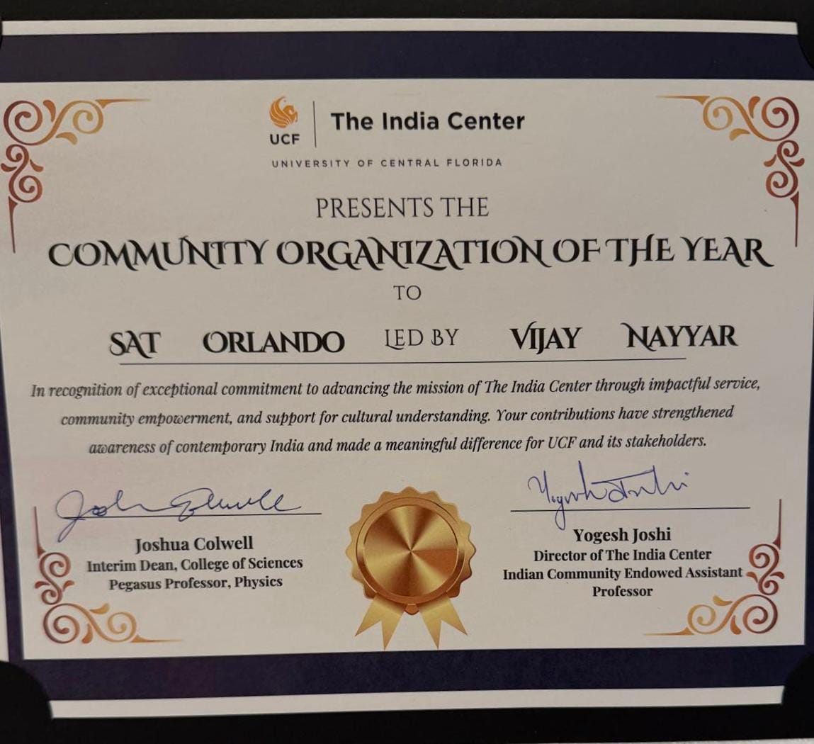 The SAT Orlando Program has been honored as Community Organization of the Year. Vijay Nayyar received the award, presented by Ramesh Babu Lakshmanan, the Consulate General of India in Atlanta, joined by Joshua Colwell, Dean of Sciences at the University of Central Florida, and Dr. Joshi, Director of the Indian Center, celebrating this outstanding achievement in community service. Sujith ji is also recognized for his dedicated service and valuable contributions to SAT mathematics education.